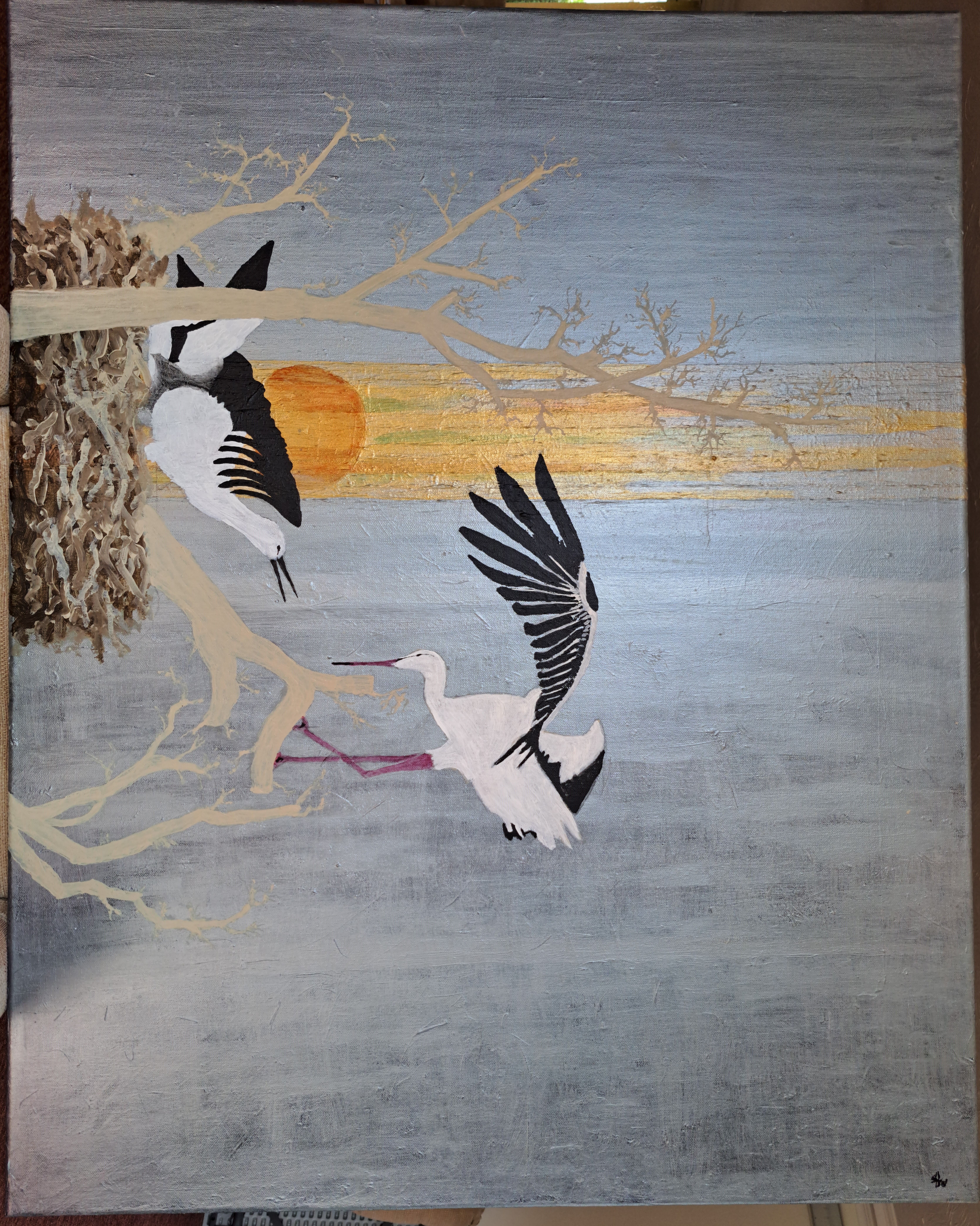 After the success of The Fall of Mariupol, I started to paint the Storks on top of a rising Sun. The enclosing branches were full of dark green leaves that I thought distracted too much from the birds. The end result is a Japanese effect.