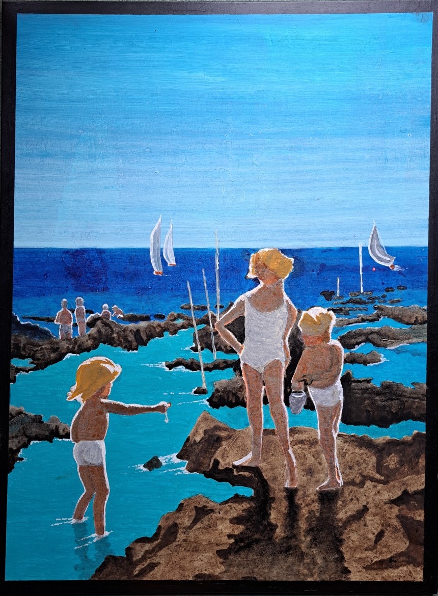 In 1933 the LNER displayed a Poster of this scene – it’s quicker by train and I have always wanted to repaint it. However the original seemed dull. So I brightened it and updated the costumes to 2024.