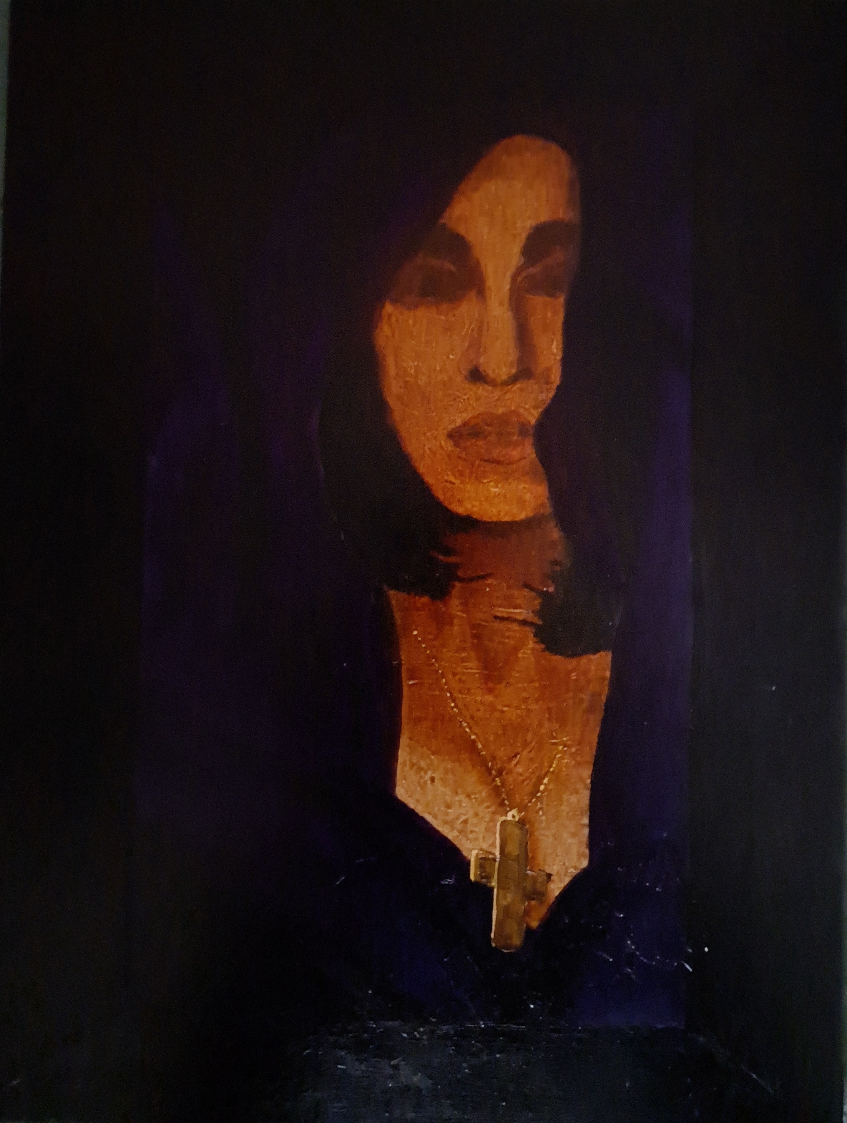 Is it an accident that a cross tickles her untanned bosom? I hope I have achieved some sensuality in my painting. It looks old, dirty, and precious.