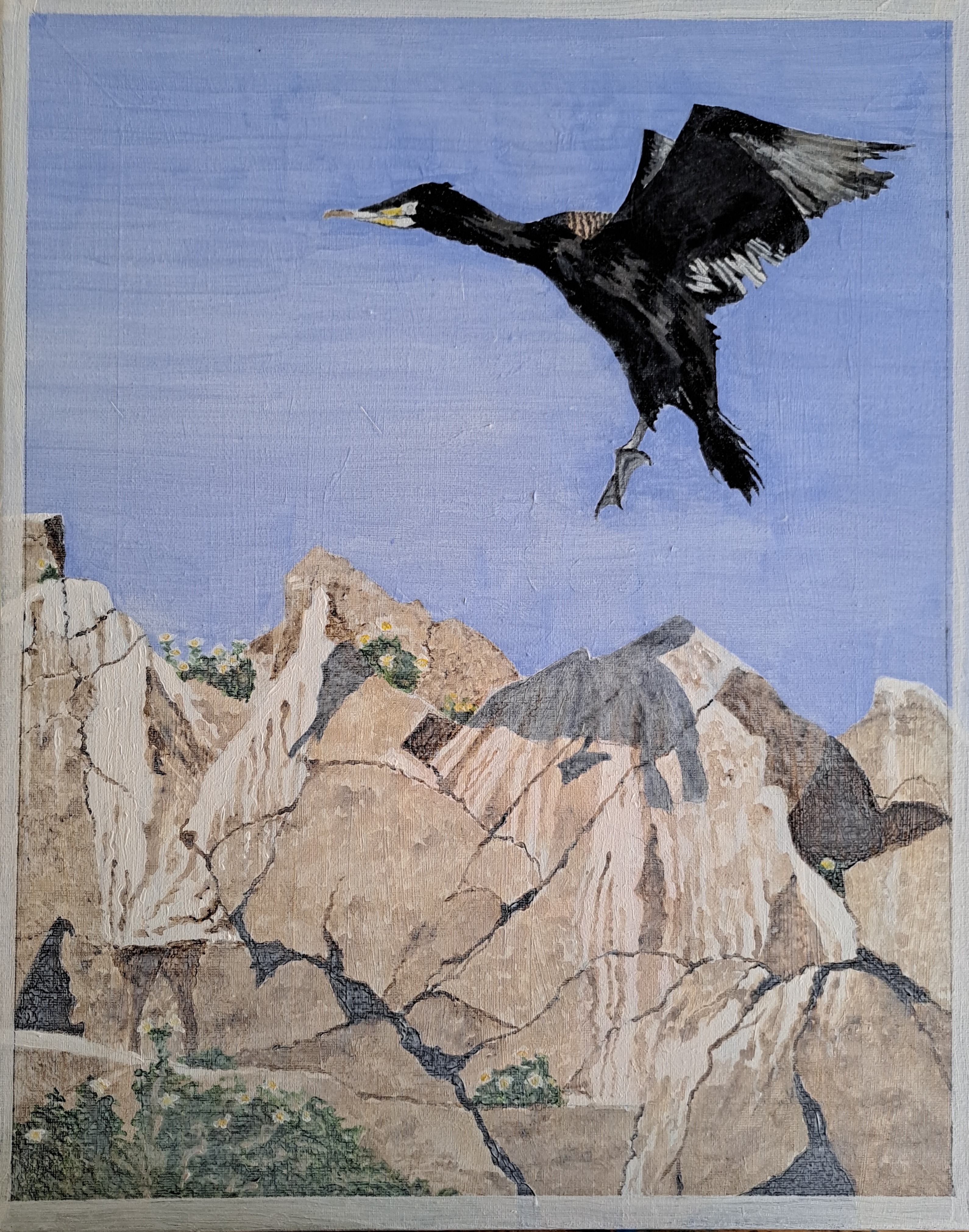 I had painted the beautiful shape of the Cormorant before. This time I added the rocks and plants for contrast.
