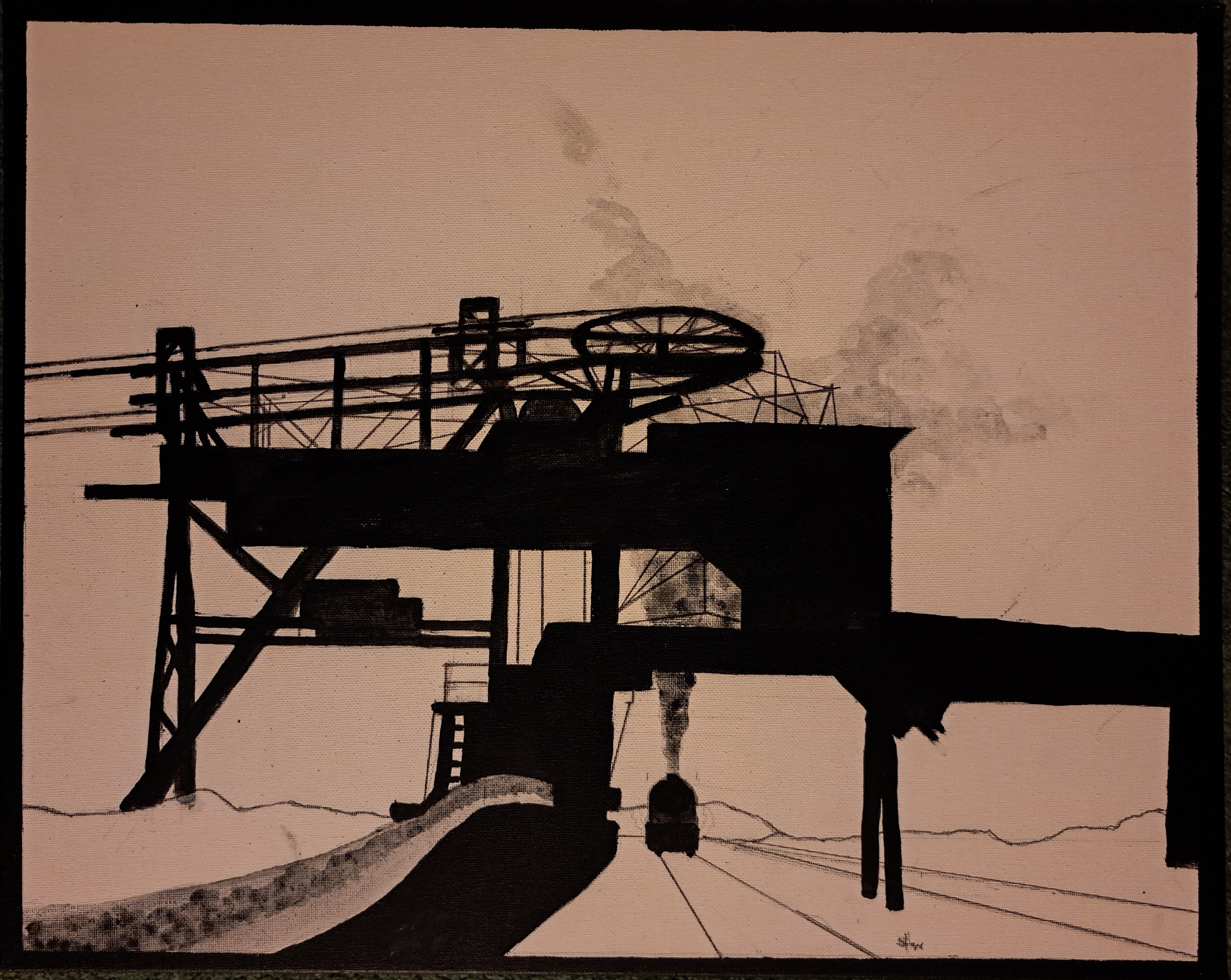 The CTG photo of this iron ore hopper was so unique I just had to paint. Again I enhanced the b/w with a covering of snow. Don’t ask me how it worked!