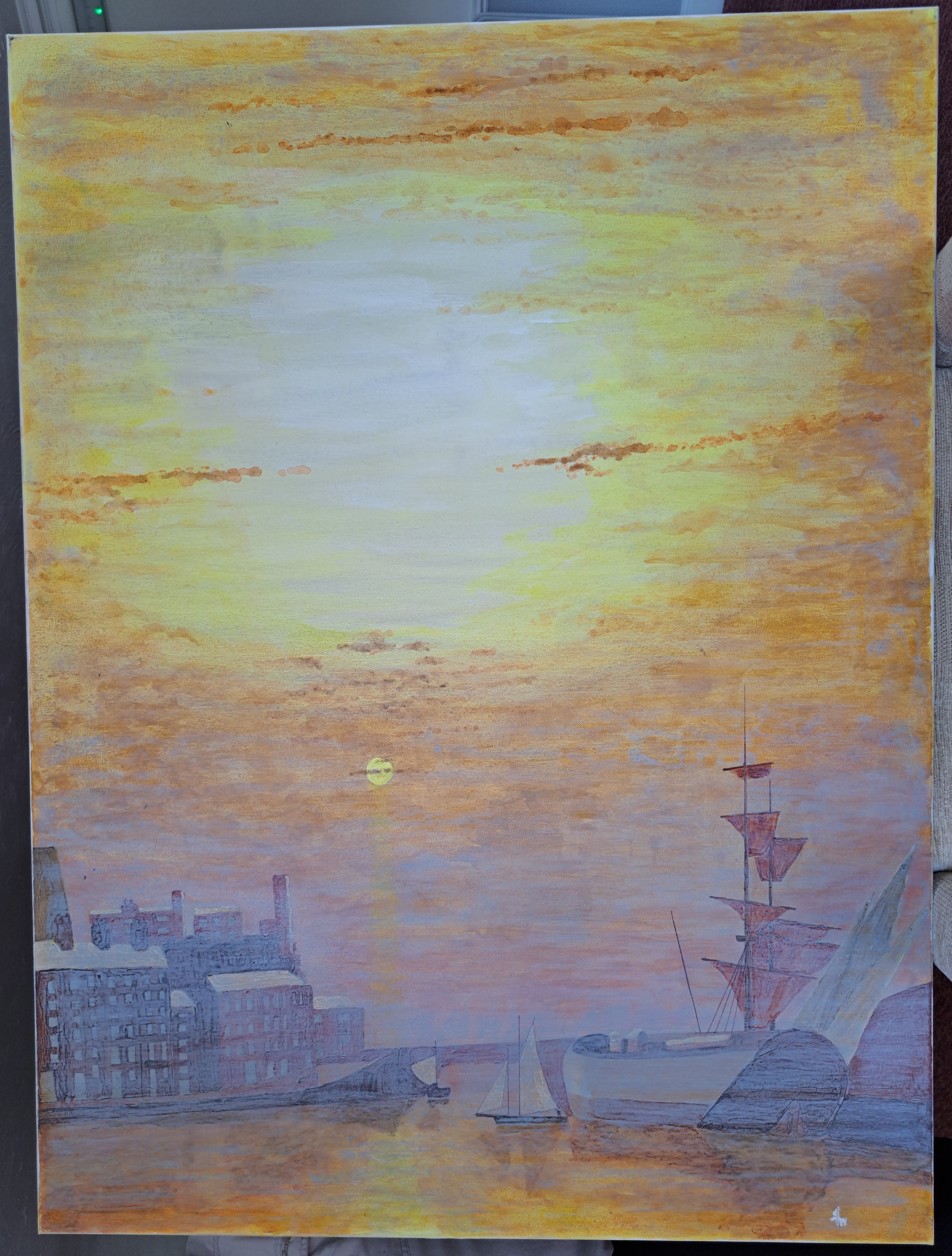 The inspiration for this came from an old black/white photo of the Harbour, and the left hand side of Turner’s “Decline of Carthage”.